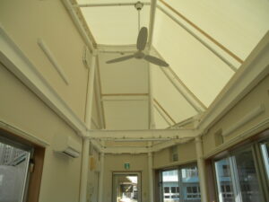 鉄骨造(高橋鐵工所) 膜屋根:ガラス繊維フッ素樹脂チタン(太陽工業) 外壁:モエンサイディングS18(ニチハ)他